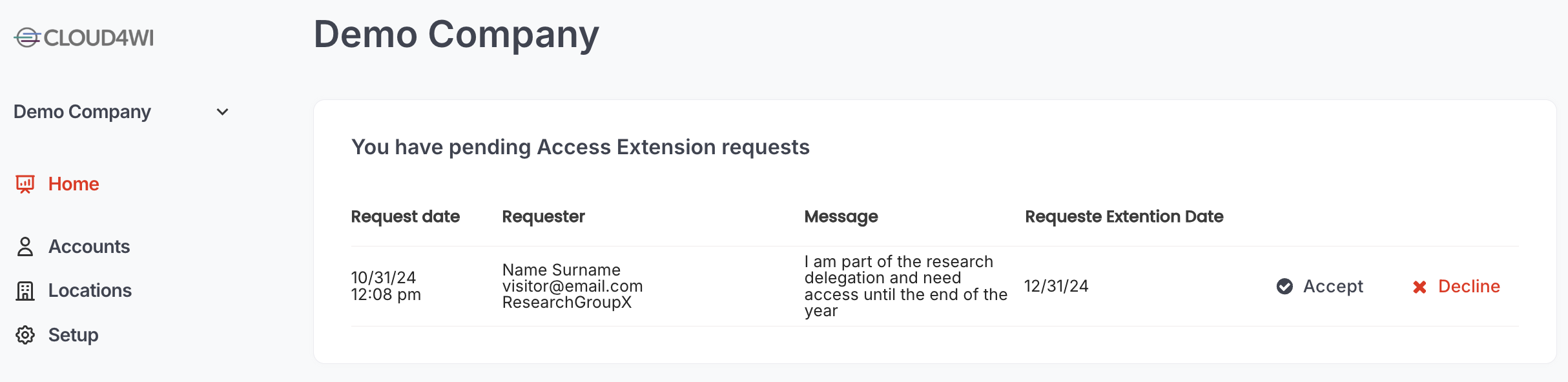 In case of pending requests, the dashboard also shows on the top a card with all the pending requests to be handled. The Admin can simply click on **Accept** or **Decline** buttons to quickly handle the request or click on the name of the Requester to open the Visitor page and change the termination date manually to any desired date.