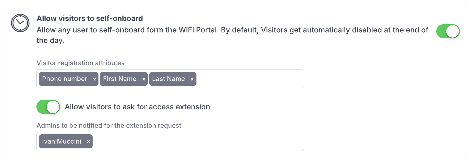 You can optionally enable the capability to let visitors request an access extension, but enabling the option **Allow visitors to ask for access extension**. In this case you need to specify one or more Admins that will be notified of the request in the field **Admins to be notified for the extension request**.