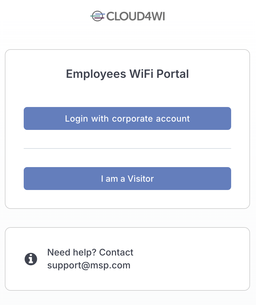 When a visitors lands on the WiFI Portal, a new button "I am a visitor" appears in case the option is enabled.