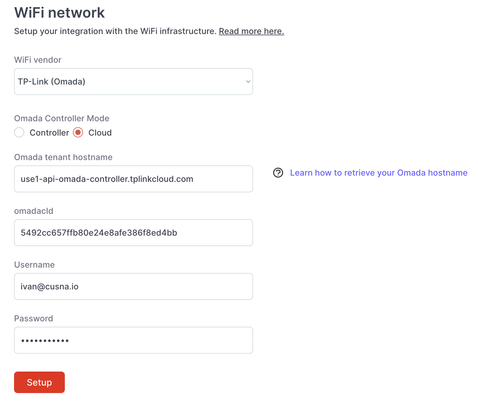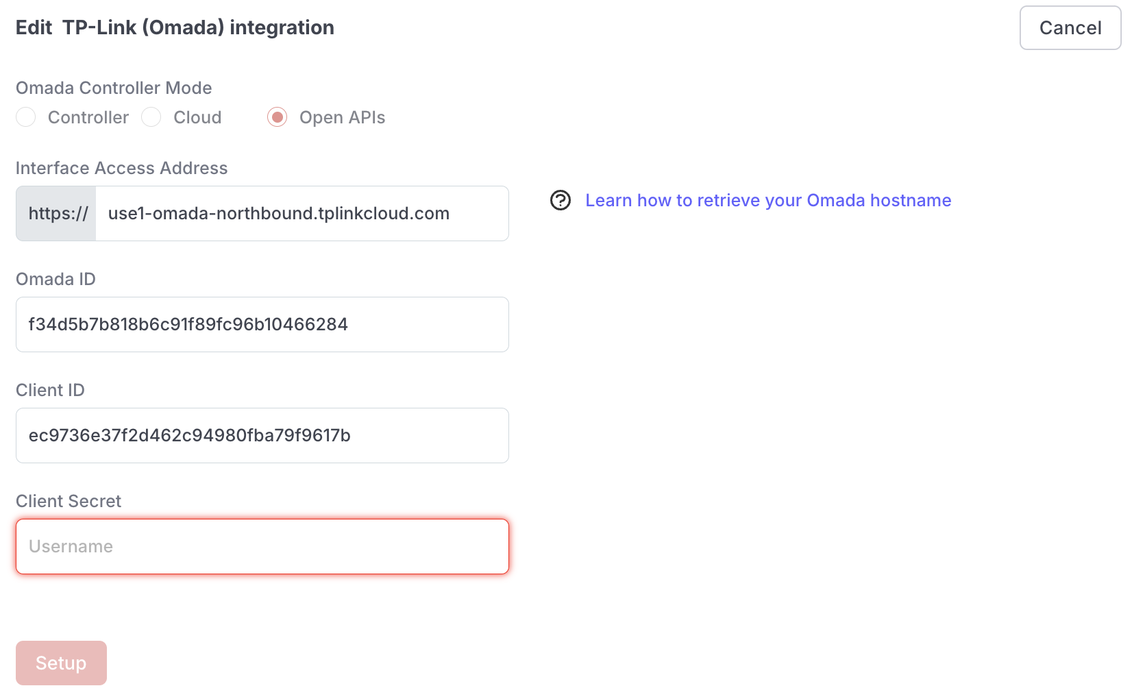* **Omada tenant hostname**: the hostname of your Omada account as indicated above