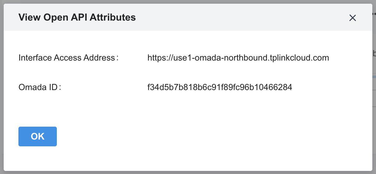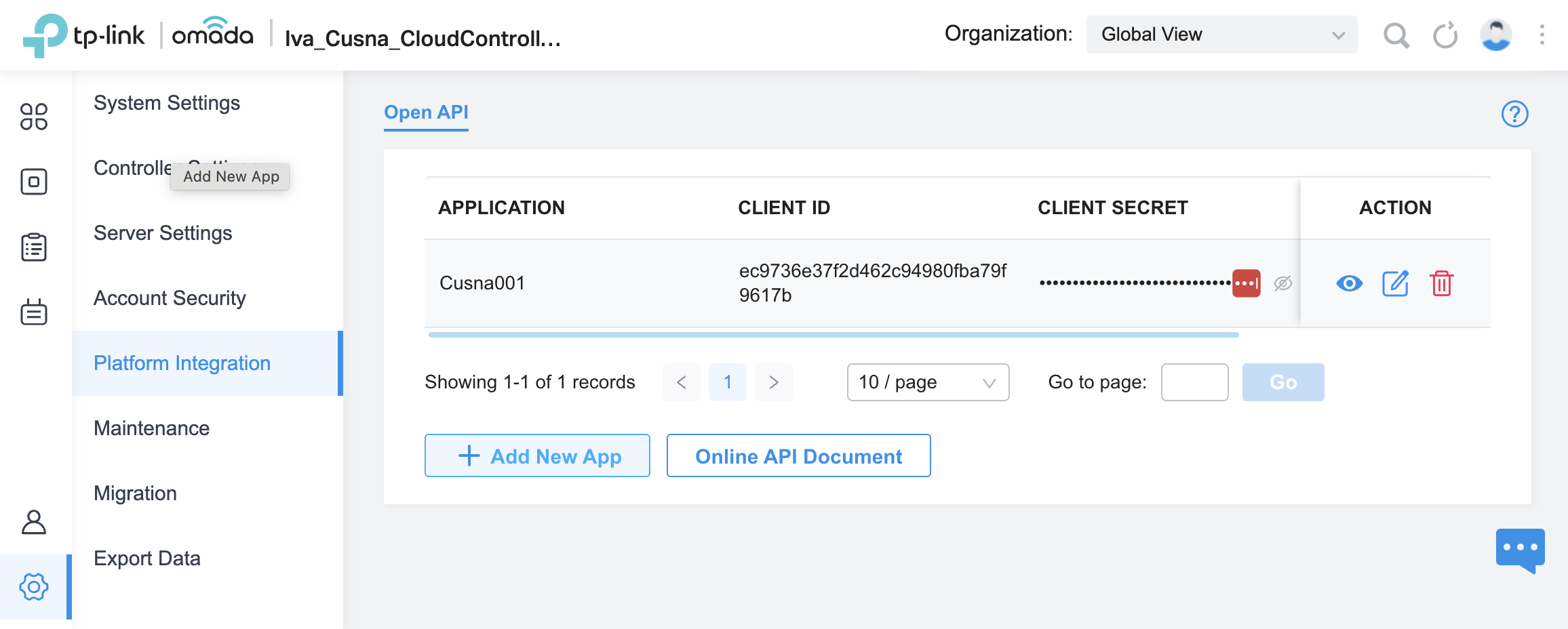 Click on the eye icon, to open the **View Open API** Attributes and copy the **Interface Access Address** and the **Omada ID**.