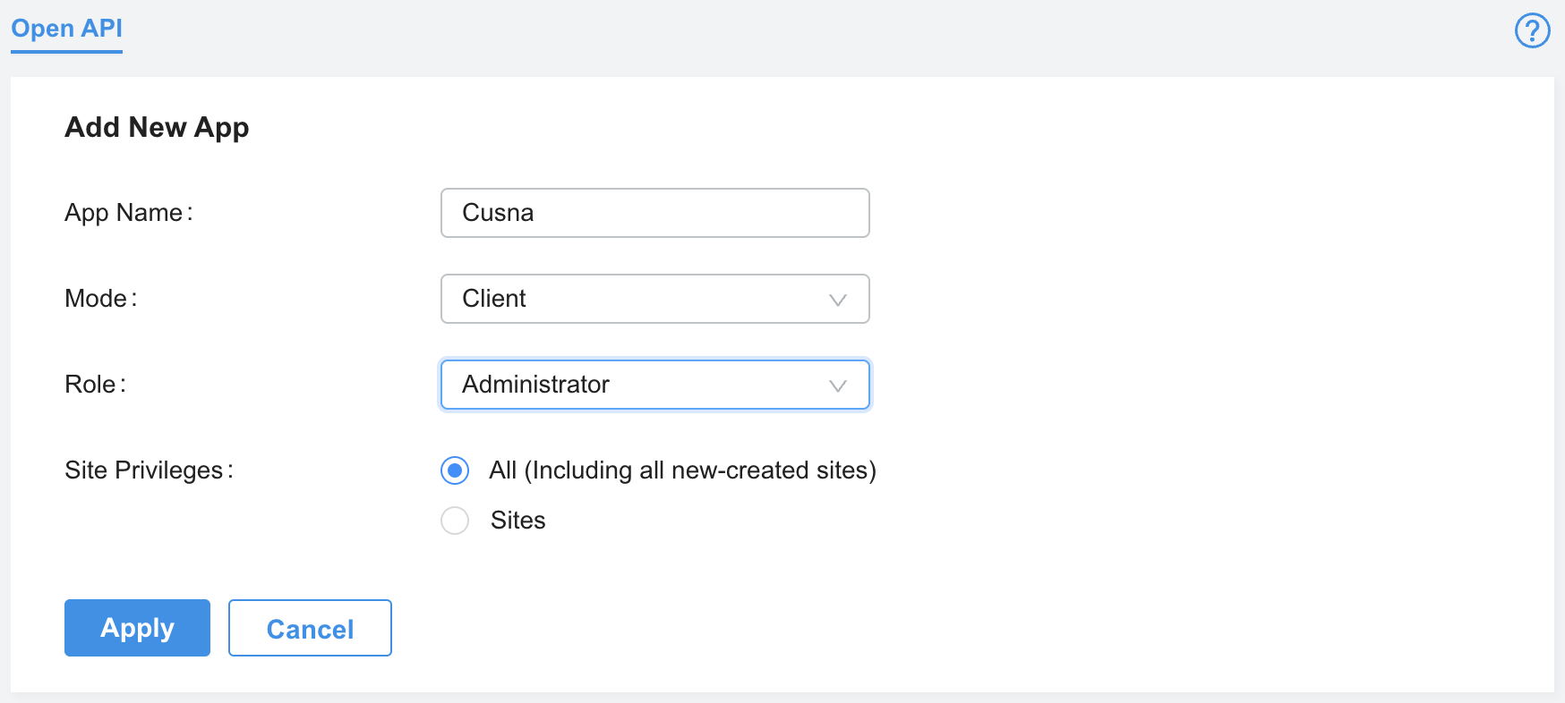 In Global View or MSP View, go to **Settings** > **Platform Integration** > **Open API**. 2. Click  **+ Add New App**. The Open API dialog appears.